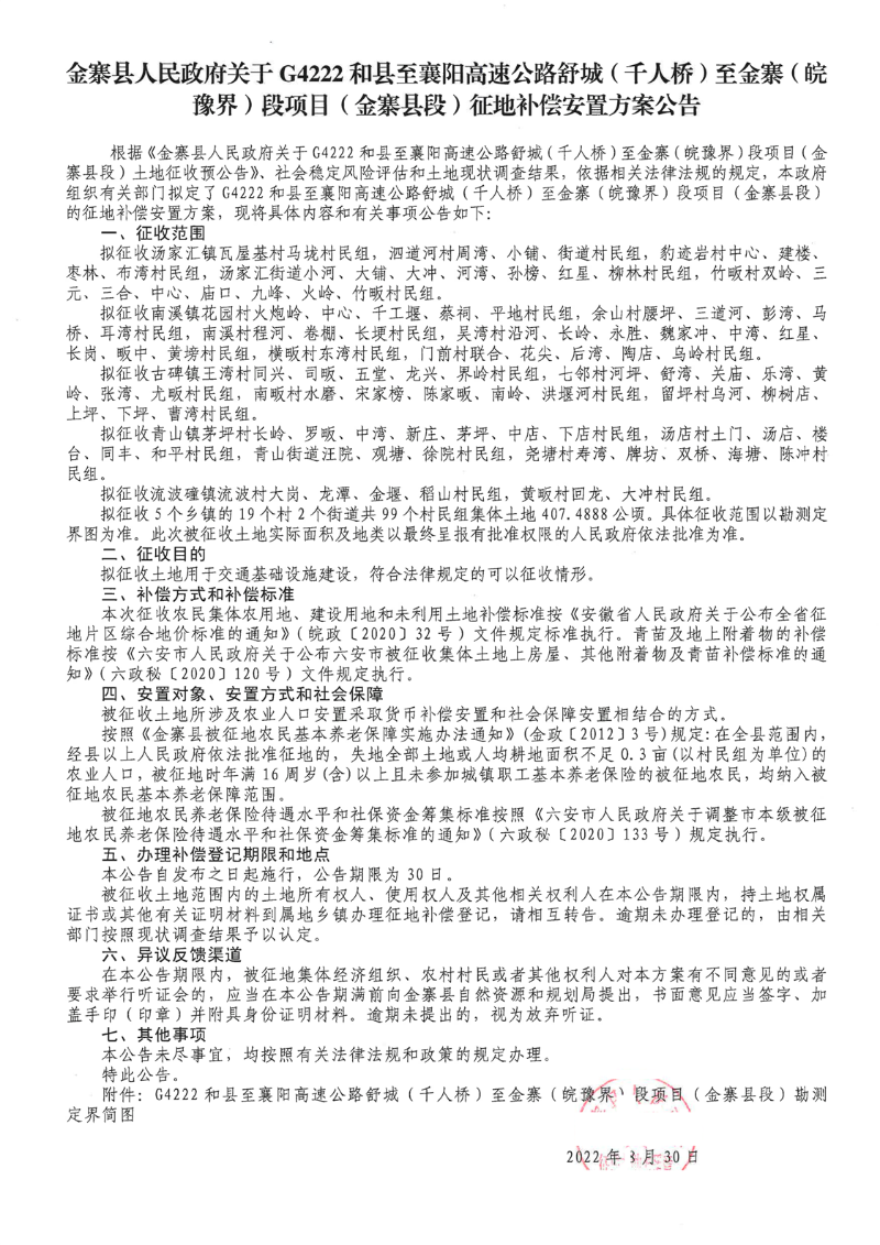金寨县人民政府关于G4222和县至襄阳高速公路舒城(千人桥)至金寨(皖豫界)段项目(金寨县段)征地补偿安置方案公告
