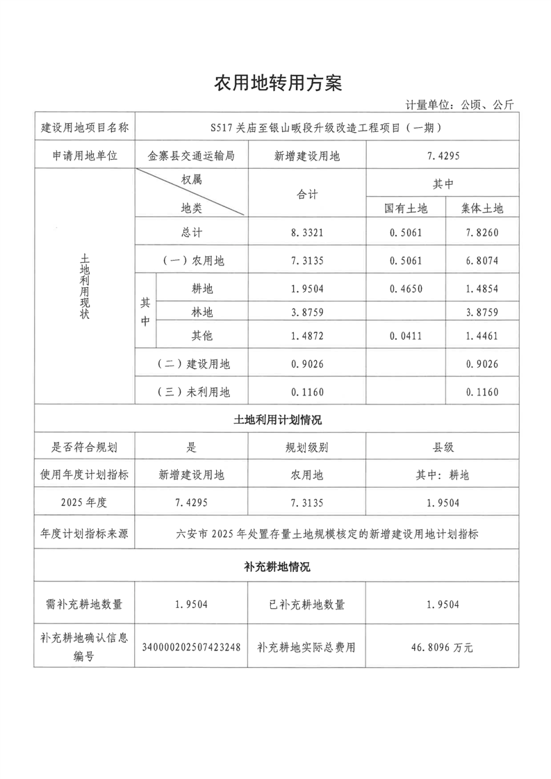 S517关庙至银山畈段升级改造工程项目(一期)农用地转用方案
