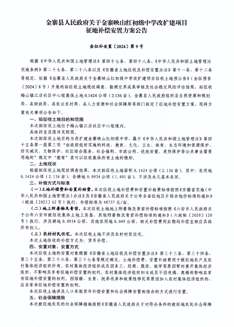 金寨县人民政府关于金寨映山红初级中学改扩建项目征地补偿安置方案公告(金征补安置〔2024〕第9号)