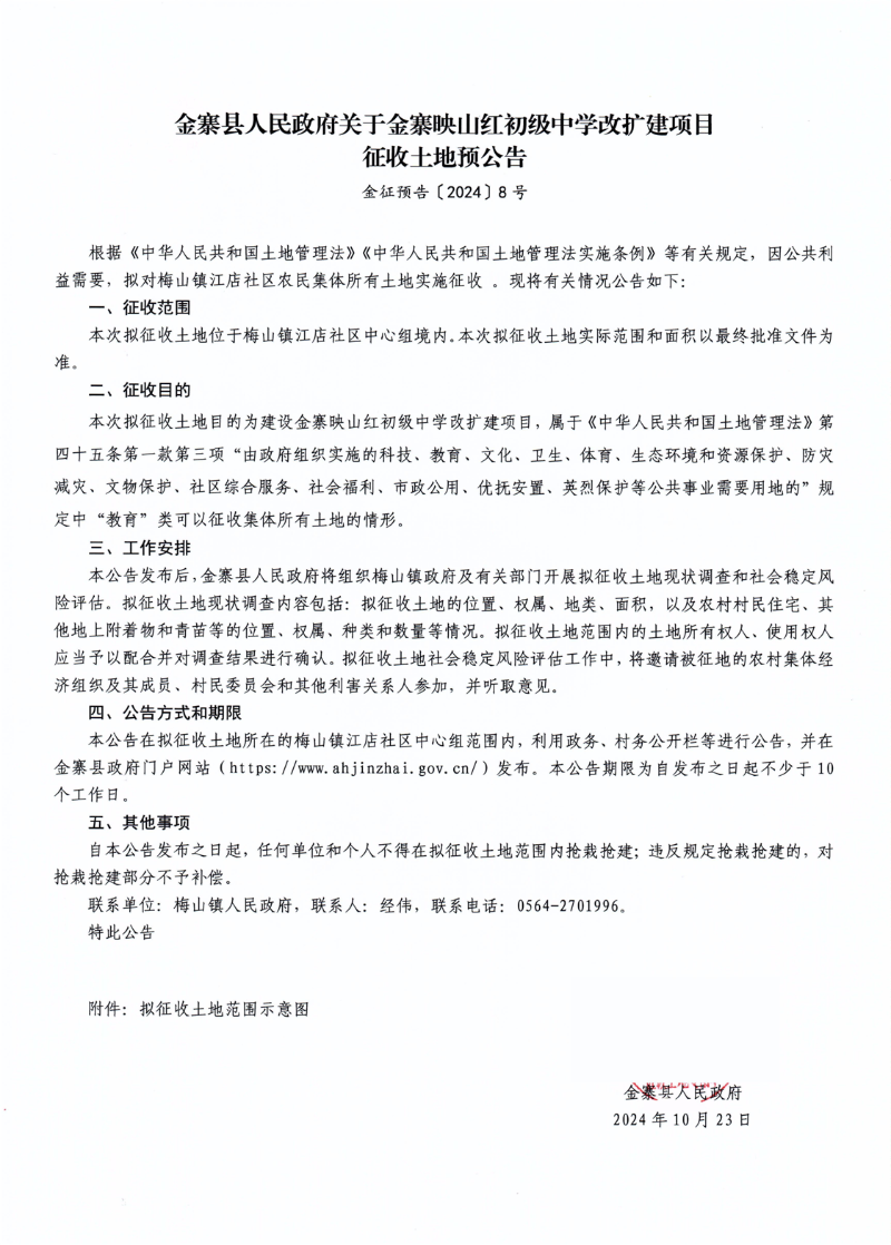 金寨县人民政府关于金寨映山红初级中学改扩建项目征收土地预公告(金征预告〔2024〕8号)
