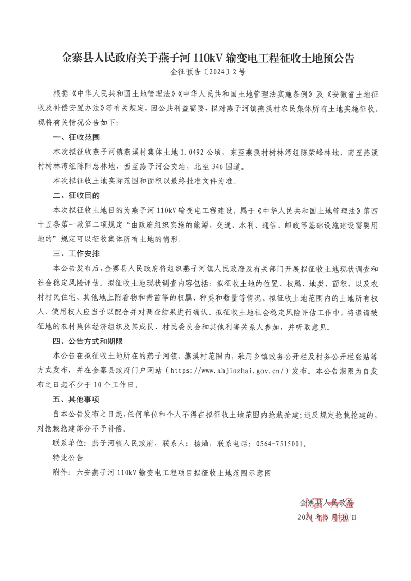 金寨县人民政府关于燕子河110kV输变电工程征收土地预公告(金征预告〔2024〕2号)
