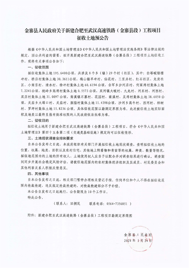 金寨县人民政府关于新建合肥至武汉高速铁路(金寨县段)工程项目征收土地预公告
