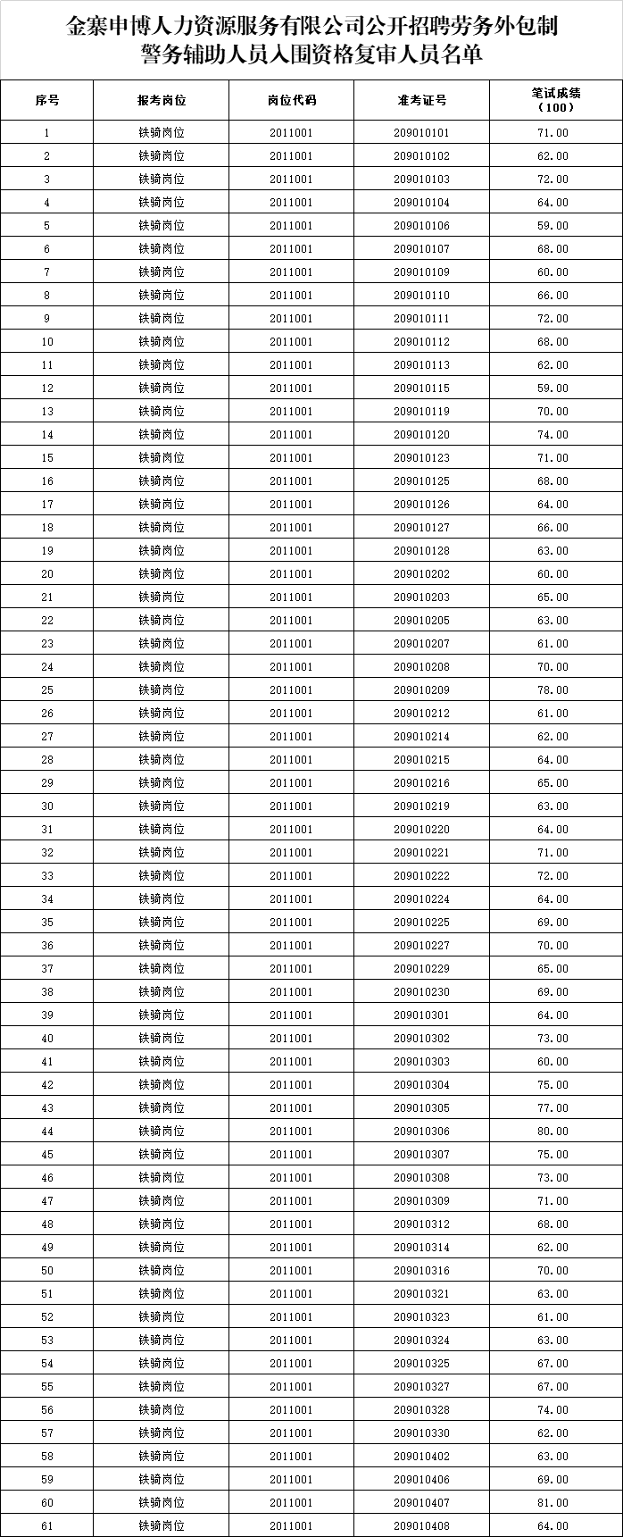 金寨申博人力资源服务有限公司公开招聘劳务外包制警务辅助人员笔试成绩已公布,根据《招聘公告》规定,入围资格复审人员已确定。现将进入资格复审环节有关事项通知如下: