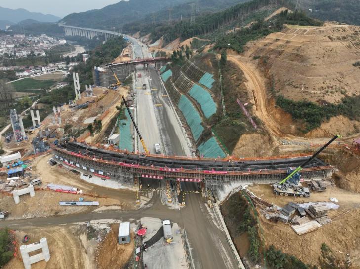 青山枢纽上跨区现浇箱梁施工。天堂寨支线高速公路项目部供图
