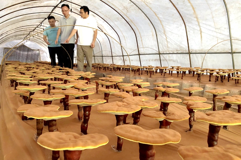 图为金寨县力源食用菌种植专业合作社管理人员在查看灵芝生长情况,盛夏时节,成熟的孢子粉掉落后布满塑料膜,放眼望去,一片纯正的咖啡色。
