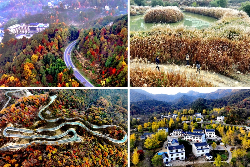 金秋时节,地处大别山区的金寨县山区乡村处处秋意盎然,色彩斑斓,层峦叠嶂的群山万山红遍、层林尽染,构成一幅幅美丽的画卷。