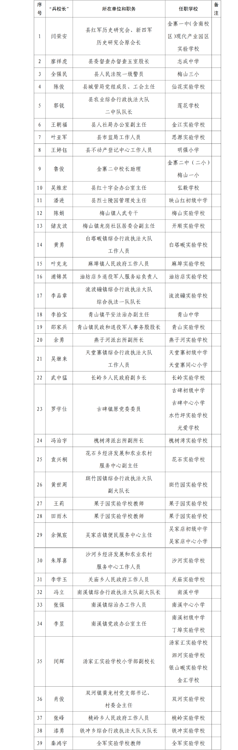 近日,县退役军人事务局、县教育局联合发文《关于聘任闫荣安等39名退役军人为全县第二批中小学校“兵校长”的通知》。经单位推荐、审核把关、集体研究,现决定聘任闫荣安等39名退役军人为全县第二批中小学校“兵校长”。希望“兵校长”加强与学校的常态化沟通联动,认真履行国防教育相关职责任务,不断丰富教育形式、深化教育内涵,推动中小学校国防教育工作再上新台阶。